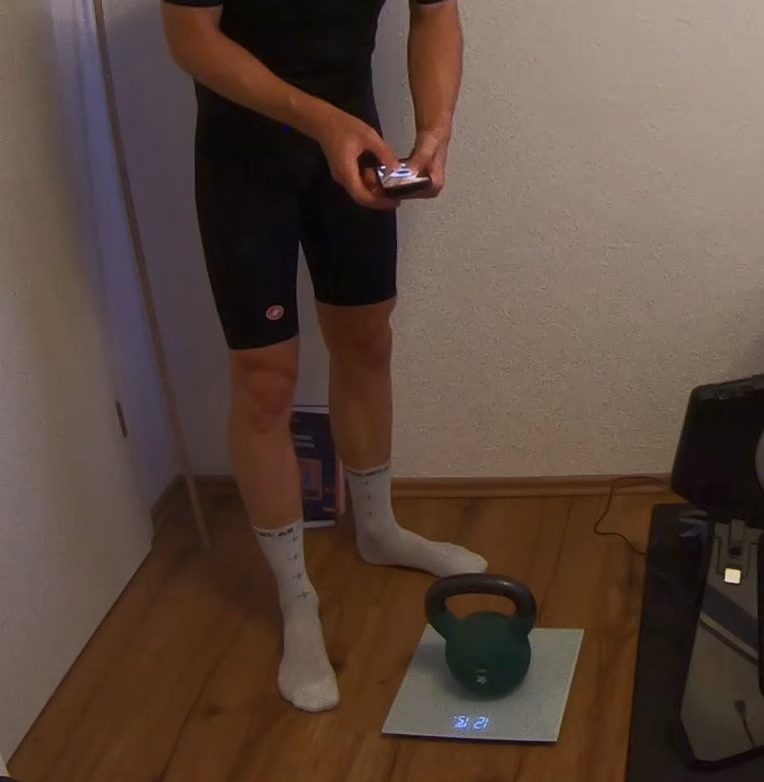 Nach etwa einer Stunde war der Test geschafft. Danach habe ich mich direkt gewogen. Zuerst die Unterseite der Waage gefilmt, dann ein 12-kg-Kettlebell daraufgestellt, um die Genauigkeit zu zeigen. Danach habe ich mich selbst gewogen und anschließend zusammen mit dem Kettlebell – alles doppelt gefilmt, mit GoPro und iPhone, um jede Manipulation auszuschließen.